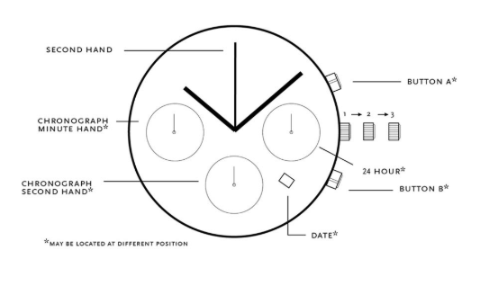 ИСПОЛЬЗОВАНИЕ ХРОНОГРАФА: Этот хронограф может измерять и отображать время за 1/1 секунды с максимальным значением 59 минут 59 секунд. Нажмите кнопку A, чтобы запустить или остановить часы. Нажмите кнопку B, чтобы вернуть секундомер в исходное положение. СБРОС ХРОНОГРАФА (ТАКЖЕ ПОСЛЕ ЗАМЕНЫ БАТАРЕИ): Когда секундная стрелка хронографа не возвращается в нулевое положение после сброса и замены батареи. Вытяните заводную головку в 3-е положение. Нажмите кнопку A, чтобы установить секундную стрелку хронографа в нулевое положение. Стрелку хронографа можно быстро продвигать, непрерывно нажимая кнопку A. Верните заводную головку в положение 1.