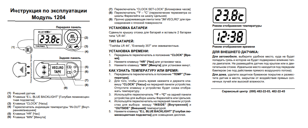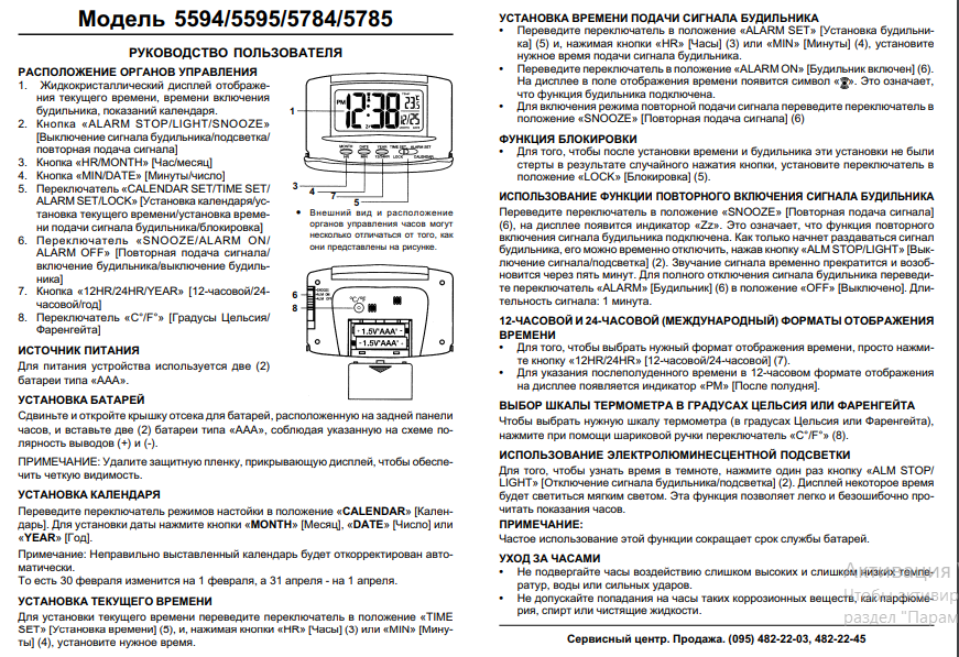 Откройте крышку батарейного отсека на задней стороне будильника и вставьте батарейку типа ”AAA” правильно соблюдая полярность. Установите крышку батарейного отсека на место. Батарейка, поставляемая вместе с будильником, является проверочной и может не обеспечить нормальную работу будильника. Установка календаря: Переведите переключатель в положение Calendar. Кнопками Month, Date и Year установите текущую дату. Невозможная дата будет автоматически исправлена на возможную. Установка часов: Передвиньте переключатель 5 в положение Clock Set и кнопками Hr (часы), Min (минуты) установите текущее время. Установка будильника: 1. Передвиньте переключатель 5 в положение Alarm Set, на дисплее появится значок “Al”. Кнопками Hr (часы), Min (минуты) установите время сигнала. 2. Передвиньте переключатель 6 в положение Alarm On. На дисплее появится значок сигнала. При этом будильник перейдет в состояние готовности. 3. Чтобы активизировать функцию Snooze переведите переключатель 6 в положение Snooze Alarm. Функция Lock. После установки часов и будильника передвиньте переключатель 5 в положение Lock для того чтобы сохранить установки в памяти будильника и помешать случайной переустановке.  Использование функции Snooze. 1. Передвиньте переключатель 6 в положение Snooze. При этом на дисплее появится надпись Zz и функция Snooze будет активизирована. 2. Если будильник прозвонит Вы можете выключить сигнал нажав на клавишу Alarm stop/Light (2). Через 5 минут ваш будильник прозвенит вновь автоматически. 3. Чтобы полностью выключить сигнал переведите переключатель 6 в положение Alarm Off. 12/24 часовой режимы. 1. Переключателем 12Hr/24Hr (7) Вы сможете выбрать 12 часовой или 24 часовой формат отображения времени. 2. Значок Pm появляется, чтобы указать на вторую половину дня в 12 часовом режиме. Выбор шкалы измерения температуры. Нажмите кнопку C/F для выбора температурной шкалы. Использования люминесцветной подсветки. Если Вы хотите посмотреть время в темном помещении, просто нажмите на клавишу Alarm  stop/Light (2) один раз. Дисплей будет освещен на несколько секунд.  Частое использование этой функции уменьшает время жизни вашей батарейки. Избегайте воздействия на ваш будильник высоких температур, воды или ударов. Избегайте  попадания на Ваш будильник активных химических (в частности спиртосодержащих) веществ.